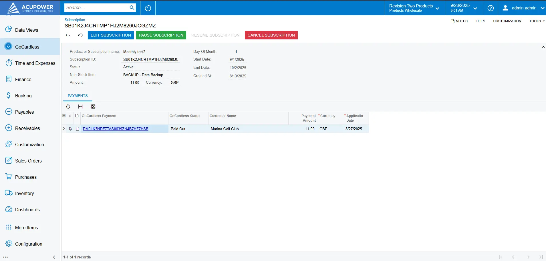 Set the billing frequency, amount, and schedule. Payments are linked to mandates and collected through GoCardless. Acumatica updates automatically as payments come in.